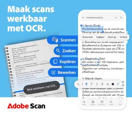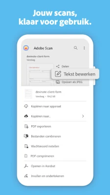 Verfijn je scans tot in perfectie met krachtige bewerkingstools. Pas helderheid en contrast aan, snijd bij, roteer of verwijder imperfecties zoals vlekken en vouwen met een paar tikken. Organiseer je digitale archief overzichtelijk in aangepaste mappen en laat Adobe Scan contactgegevens van visitekaartjes direct aan je telefoonlijst toevoegen. Het creëren van hoogwaardige PDF's is eenvoudig, waarbij tekst in afbeeldingen ontgrendeld wordt voor kopiëren en bewerken. Exporteer scans moeiteloos naar formaten als Word, Excel of PowerPoint voor verder gebruik en naadloze samenwerking. Voor uitgebreidere mogelijkheden, zoals het samenvoegen van scans of een grotere OCR-capaciteit, biedt Adobe Scan aanvullende abonnementsopties die naadloos samenwerken met Acrobat Reader voor een complete digitale workflow.