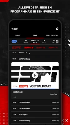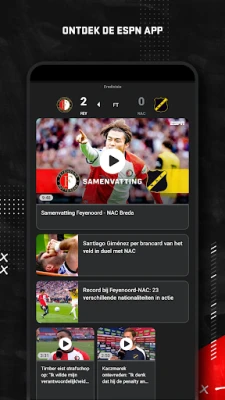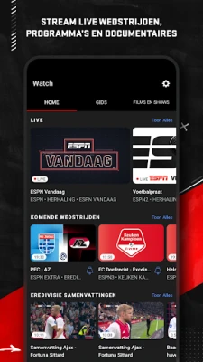 De ESPN-app is jouw ultieme sportcompanion, speciaal ontworpen voor de gepassioneerde voetballiefhebber. Abonnees ontgrendelen met ESPN WATCH een ongekende wereld van sport, direct op hun apparaat. Alle live kanalen, bloedstollende wedstrijden en diepgaande programma's die onderdeel zijn van je abonnement, zijn hier te vinden. Geniet van de vrijheid om overal en altijd de actie live te volgen, en wees als eerste op de hoogte van de meest recente samenvattingen en alle doelpunten.